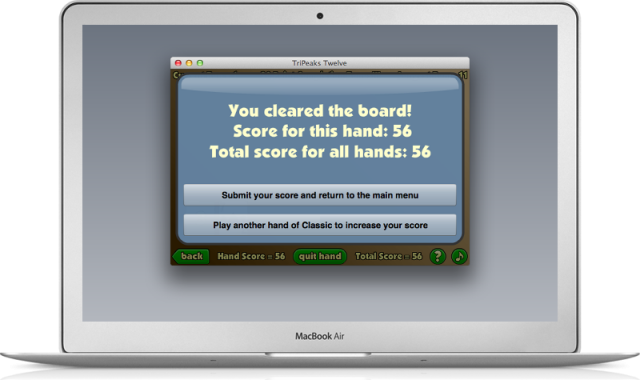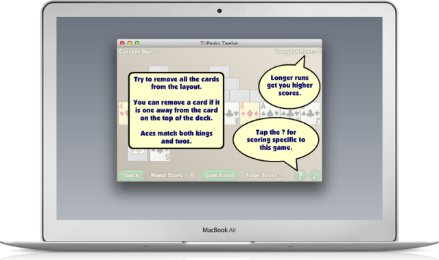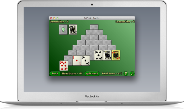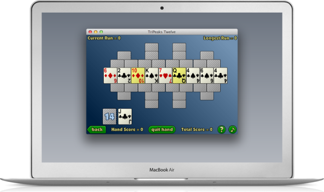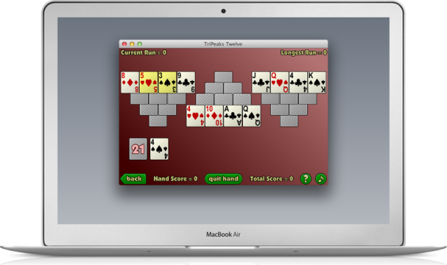 TriPeaks has been a popular computer solitaire game for twenty years, and TriPeaks Twelve is the best TriPeaks value you\'ll find. In addition to the classic three-peak game, TriPeaks Twelve has several other fun versions, ranging from really easy to nigh-impossible. The tougher levels introduce "Jokers Wild" modes so you don\'t get too frustrated. TriPeaks Twelve offers four different card styles and internet-shared high scores so you can brag about your accomplishments to the world. If you are looking for classic TriPeaks, or if you want to try something new, TriPeaks Twelve is just the thing!